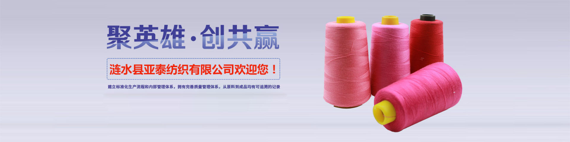 漣水縣亞泰紡織有限公司位于江蘇漣水縣,公司專業(yè)生產(chǎn)各種縫制線、織帶織布線、漁網(wǎng)線、輪胎線、風箏線等產(chǎn)品,廣泛應用于服裝、鞋帽、皮革、箱包、家紡、帳篷、漁業(yè)、勞保用品、運動用品、特種行業(yè),材質有滌綸、錦綸、氨綸等,滿足各行各業(yè)對線的需求。公司始創(chuàng)于1998年,擁有整套先進的染色制線設備,專業(yè)的技術管理人員,先進的生產(chǎn)工藝。歡迎您光臨指導、洽談合作!